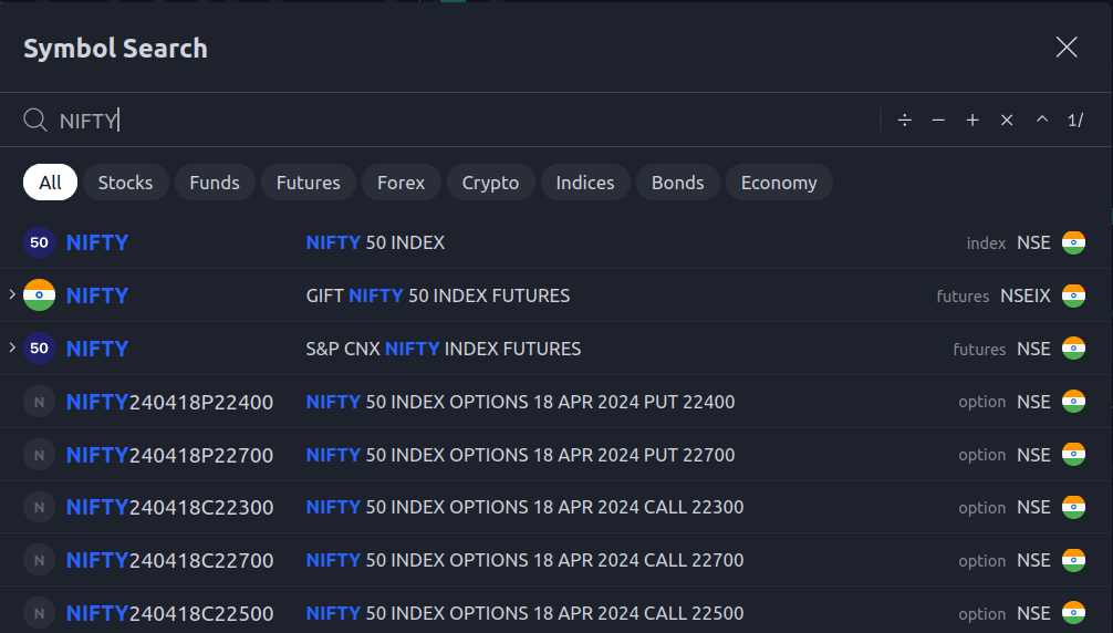 您可在商品搜尋中找到NSE選擇權。只需在「全部」頁籤的搜尋中輸入相關的標的物,對應的選擇權代碼將顯示為「選擇權」類型。