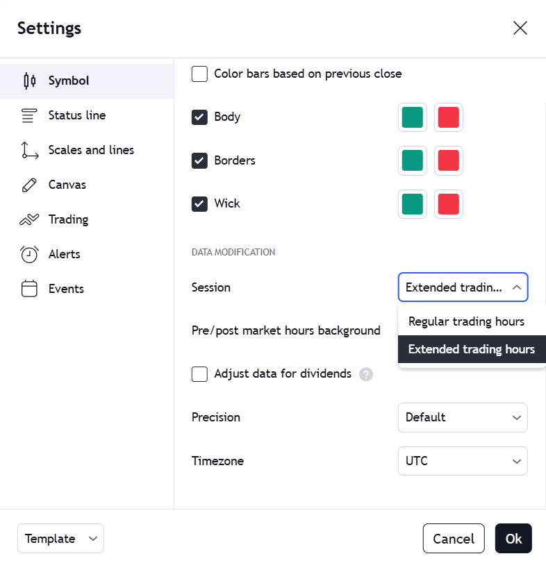 您可以透過選擇右下角的“延時" (ext) 選項或圖表設定中的商品 (Symbol) 頁籤,在日內圖表上顯示延長時間數據。在那裡,您還可以更改或刪除預設情況下在圖表上突出顯示延長時間數據的色調。