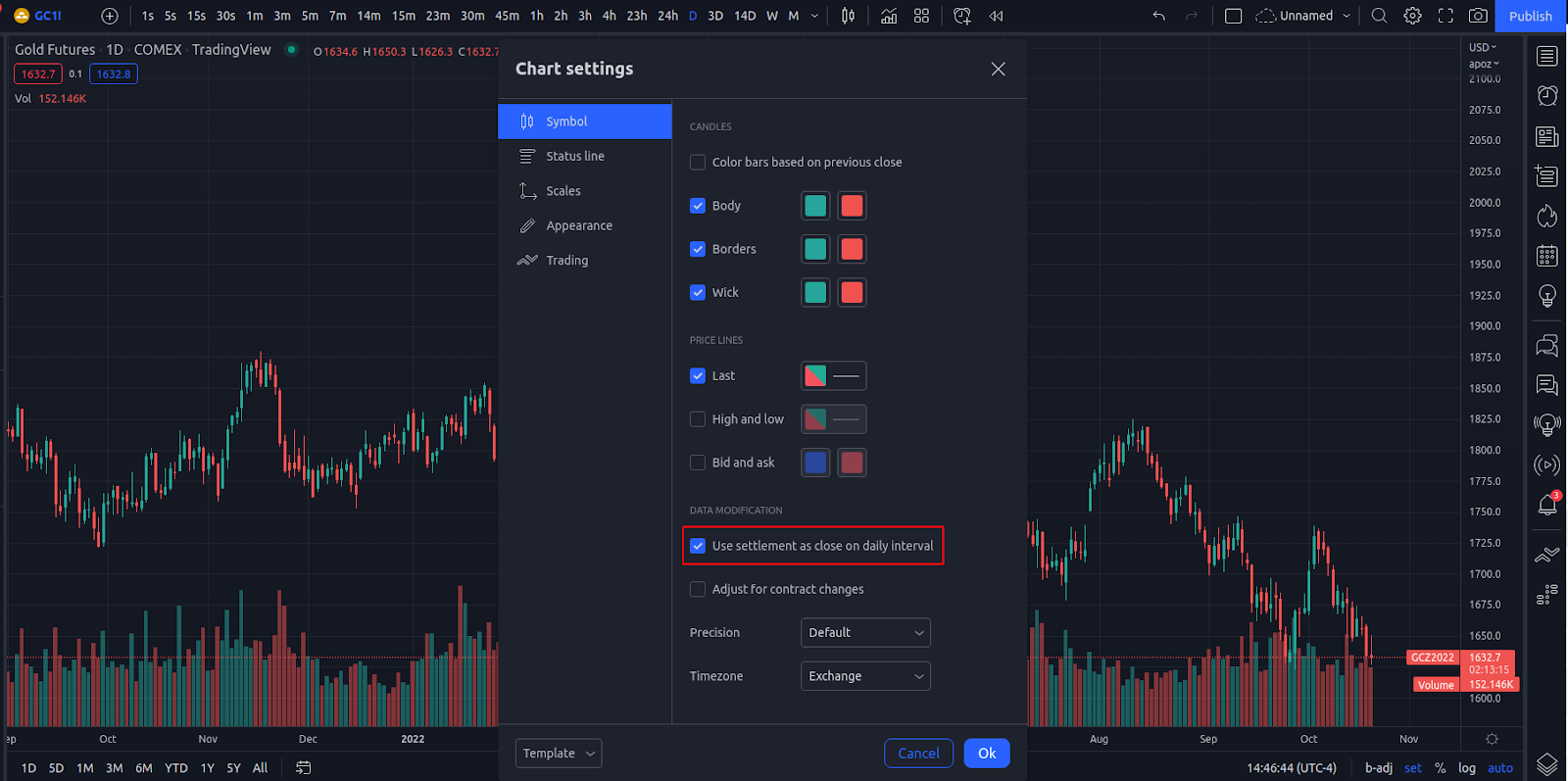 使用結算價作為日圖收盤價功能,您可以選擇在每日和更高時間週期的K線圖上顯示哪些收盤價。這項功能適用於期貨合約和連續合約。