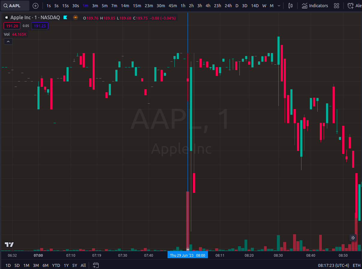 第二個顯著的差異在日內數據,由於在美國某些股票的1分鐘時間週期圖表中,盤前交易時間08:00(UTC-4)顯示了大量成交量。例如: