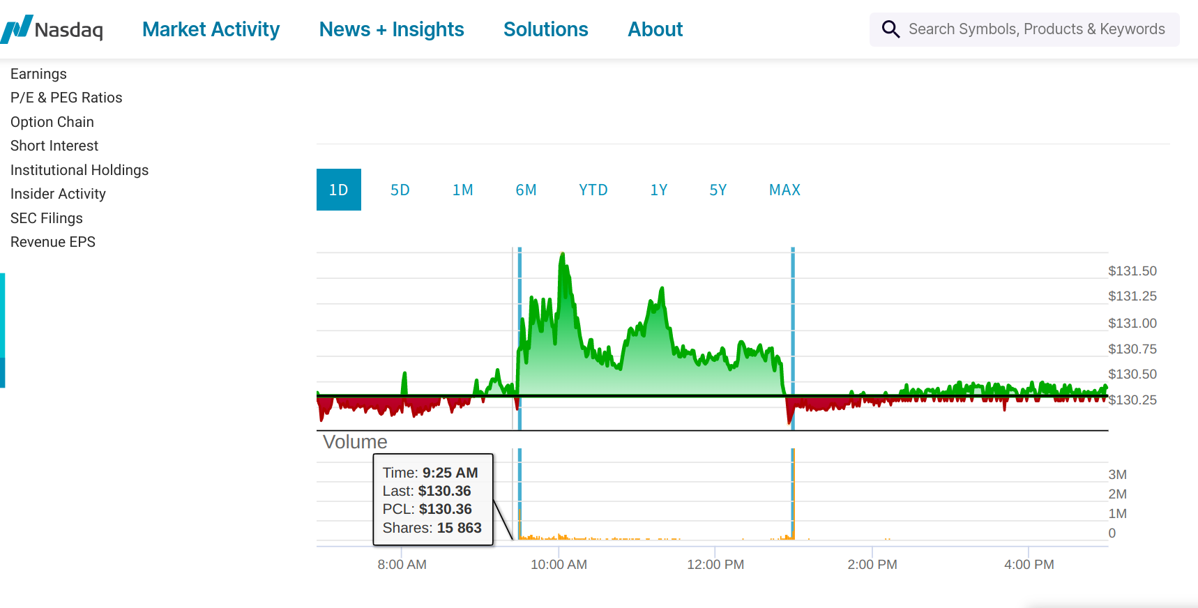 如果在我們平台上查看任何北美股票的分鐘時間週期的開盤價、最高價、最低價、收盤價和成交量數據,與交易所網站和其他資訊來源上顯示的數據進行比較,我們會注意到在盤前交易和盤後交易期間,價格數據,特別是成交量數據之間存在差異,如果按照納斯達克交易所術語來說。這些差異是因為我們的資料提供者在歷史資料中篩選掉了不規則手數的交易,因此,我們的分鐘時間週期的圖表是基於完整交易資料建構的。