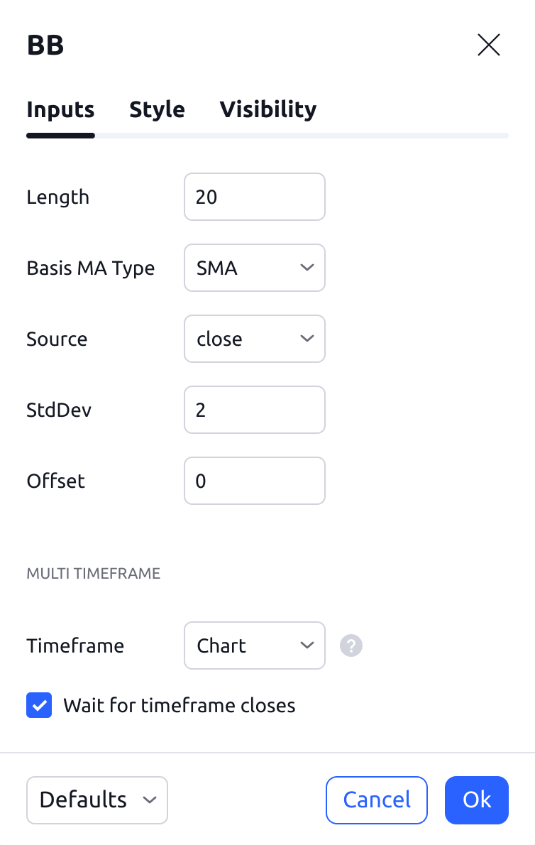 指定計算指標的時間週期。此選項允許根據另一個時間週期的資料計算BB,例如:將1H圖表上計算的BB顯示在5m圖表上。