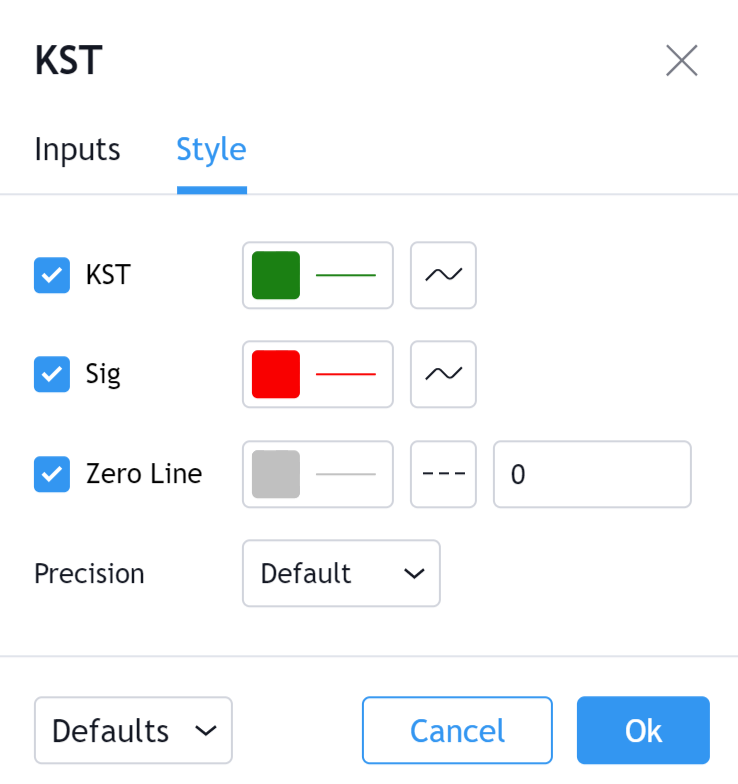 可以切換KST線的可見性以及顯示KST線當前實際值的價格線的可見性。也可以選擇KST線的顏色、線寬、和線型(預設為Line)。