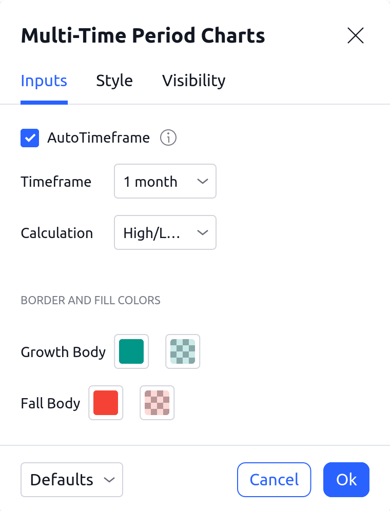 自動時間週期選擇自動選項時,指標的時間周期是根據圖表時間週期自動選擇的。時間週期下拉列表被忽略。自動時間週期是: