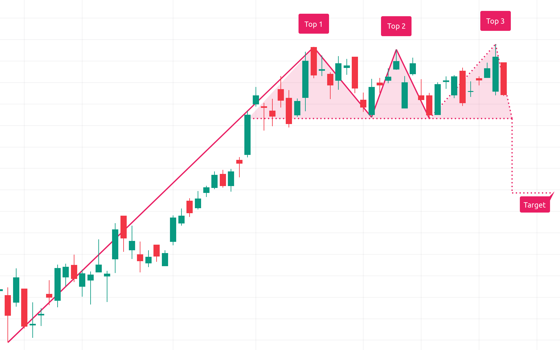 三重頂是由三個連續的同一水平的高點(允許價格值略有不同)和它們之間的兩個中間低點形成的反轉形態。預計在價格達到第三個高點後跌破中間低點水平,然後將繼續下跌大約高點和低點之間的差值。