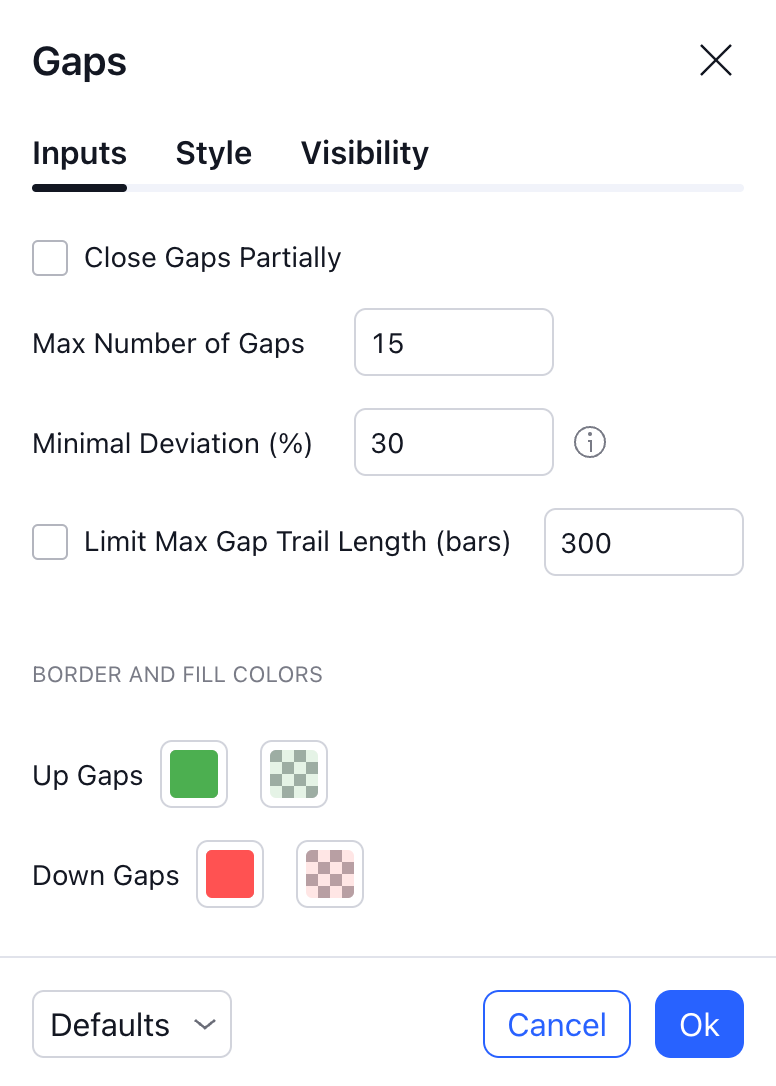 預設情況下,指標根據其寬度過濾跳空,並且僅在寬度至少為最後14個K線的平均K線範圍(高 - 低)的30%時顯示跳空。可以在輸入部分更改偏差百分比。