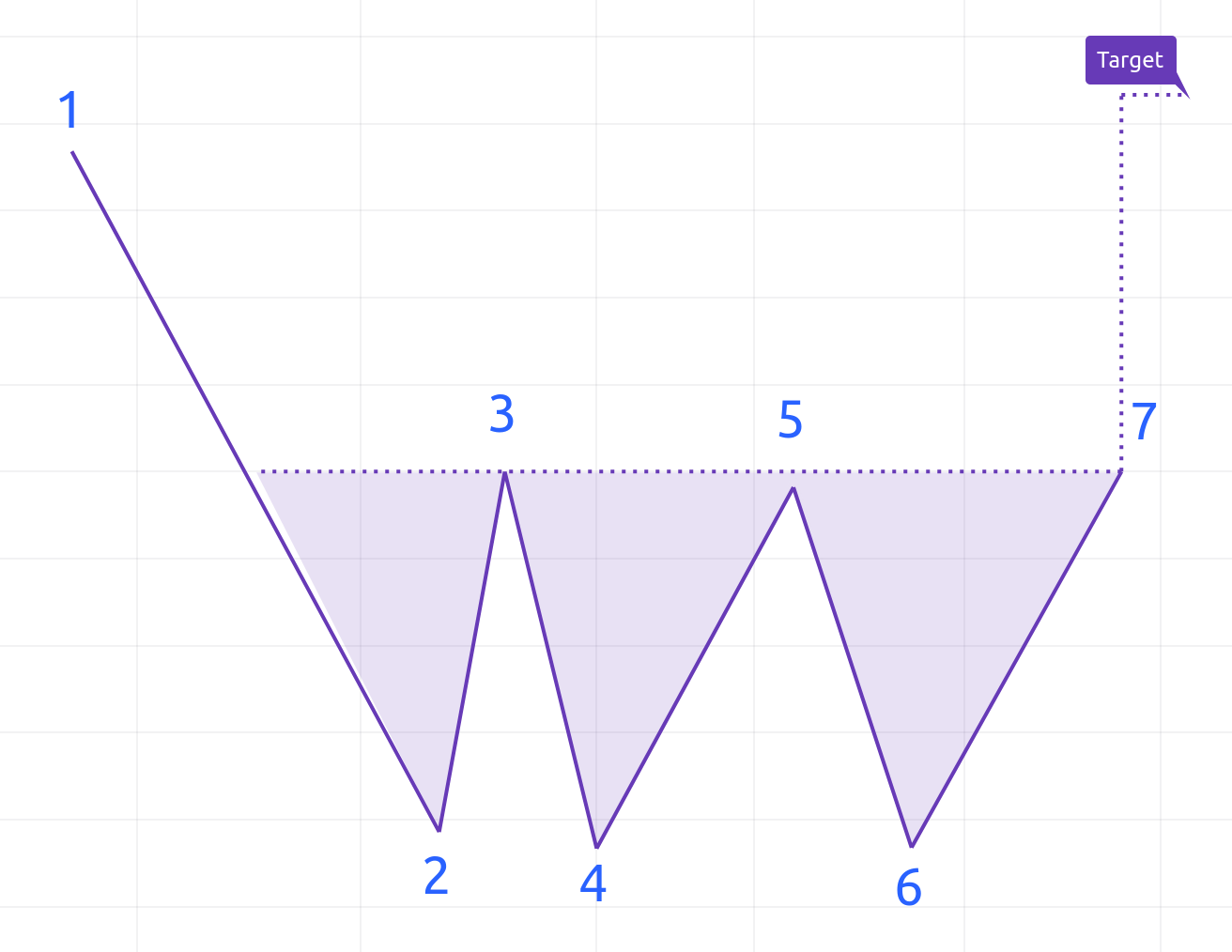 三重底是由三個連續的同一水平低點(允許價格值略有不同)和它們之間的兩個中間高點形成的反轉形態。預計在價格觸及第三個低點然後轉身並超過中間最大值水平後,價格將繼續進一步上漲大約高點和低點之間的差異。