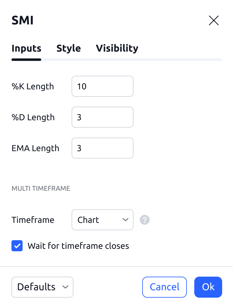 指定計算指標的時間範圍。此選項允許根據另一個時間範圍的數據計算SMI。例如:在1H圖表上計算的SMI顯示在5m圖表上。