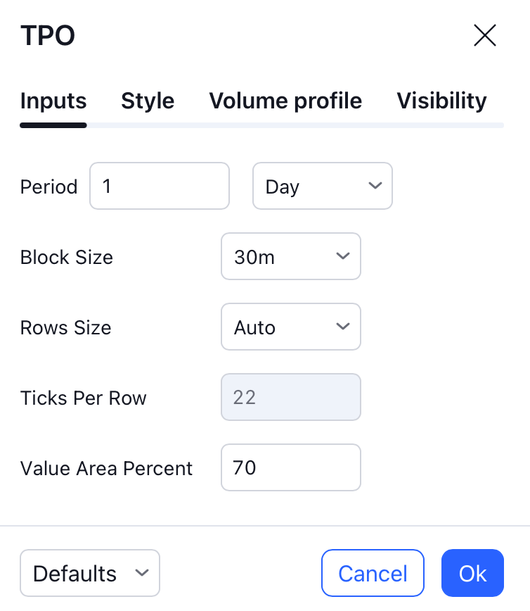 區塊大小:劃分分佈圖週期的時間塊大小。較小的分佈圖可產生更精細的結果。可用的值為 5、10、15、30 分鐘以及 1、2 和 4 小時。預設大小為 30 分鐘。此值會影響TPO和交易量分佈圖的計算。
