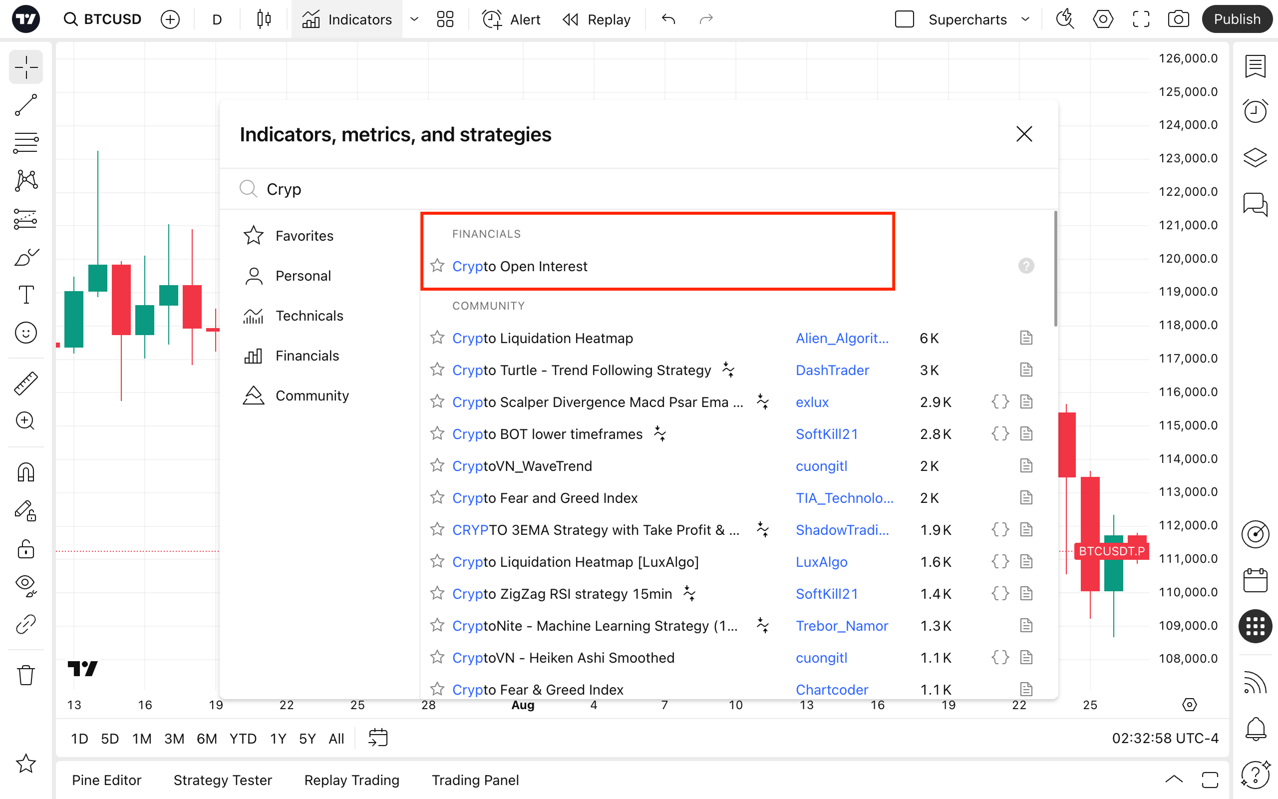 在圖表中,加密貨幣衍生性商品的未平倉合約資料可在「財務」頁籤中的「加密貨幣未平倉合約」指標中找到。