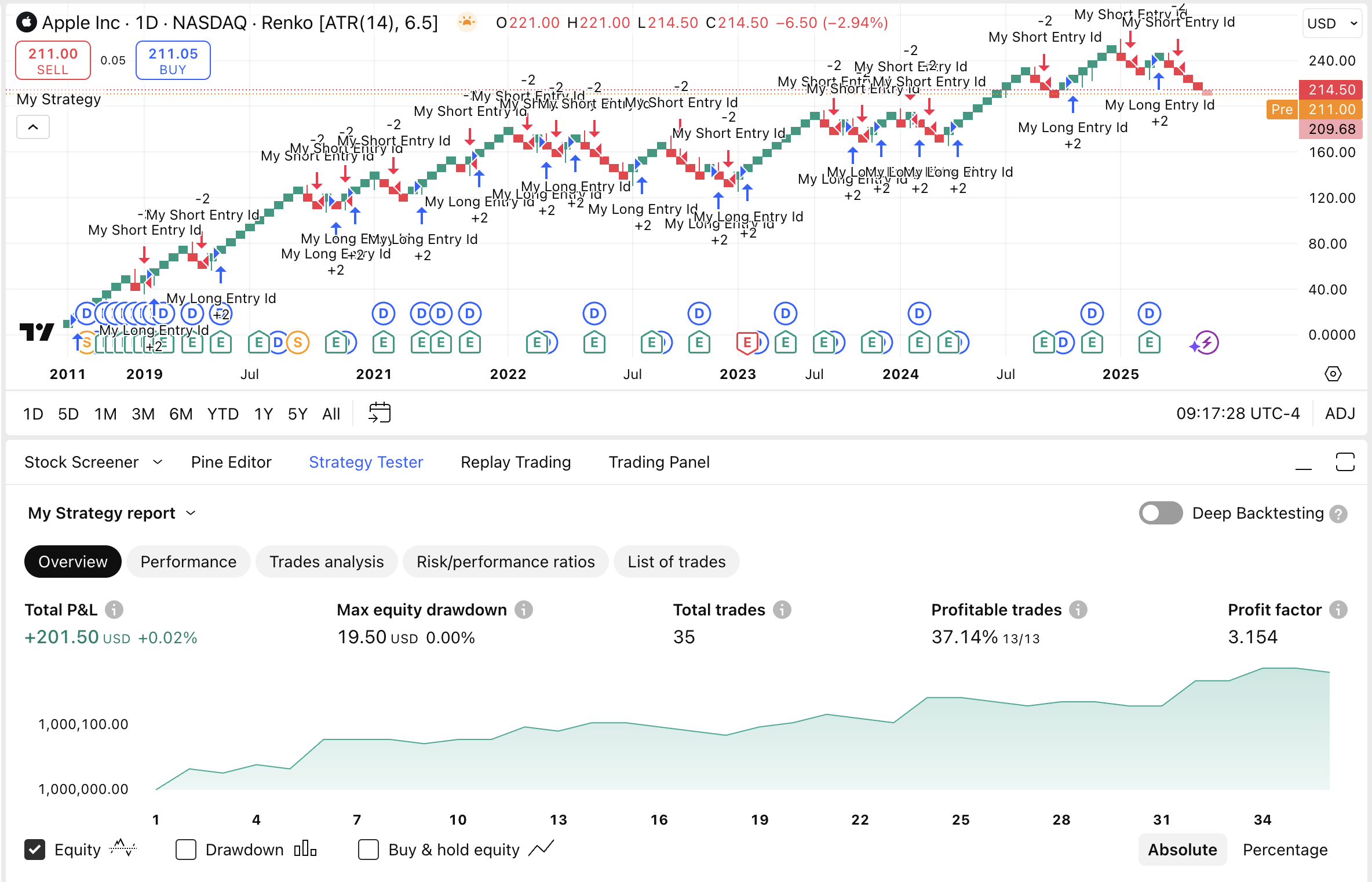 但是,如果您在任何非標準圖表類型上運行相同的策略,您將獲得無法在實際市場上複製的不同結果。例如:在磚形圖上,我們獲得以下內容: