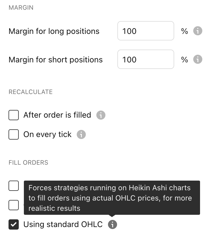 注意:平均K線圖表與其他非標準類型不同,因為雖然OHLC是合成的,但平均K線圖的K線與時間坐標的關聯方式與常規圖表相同。因此,每個常規圖表K線都恰好有一個基於其計算的平均K線圖的K線。因此,可以根據平均K線圖表中的數據計算策略,但仍可以根據標準圖表中的非合成數據開倉和平倉。若要啟用此選項,請開啟策略的屬性並選擇“使用標準OHLC”選項。