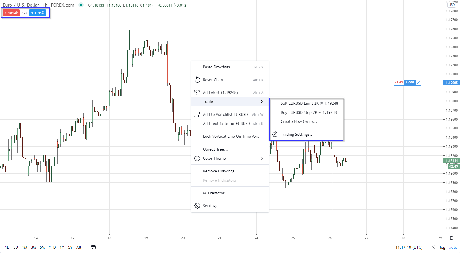 您可以透過以下幾種方式下訂單:透過 交易面板、圖表上下文 選單、圖表上的 "+" 號、或透過 買/賣 按鈕。