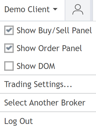 交易面板右上角的選單可讓您調整交易屬性、斷開連接、或選擇其他經紀商。您的賬戶ID和賬戶幣種也會顯示在此處。