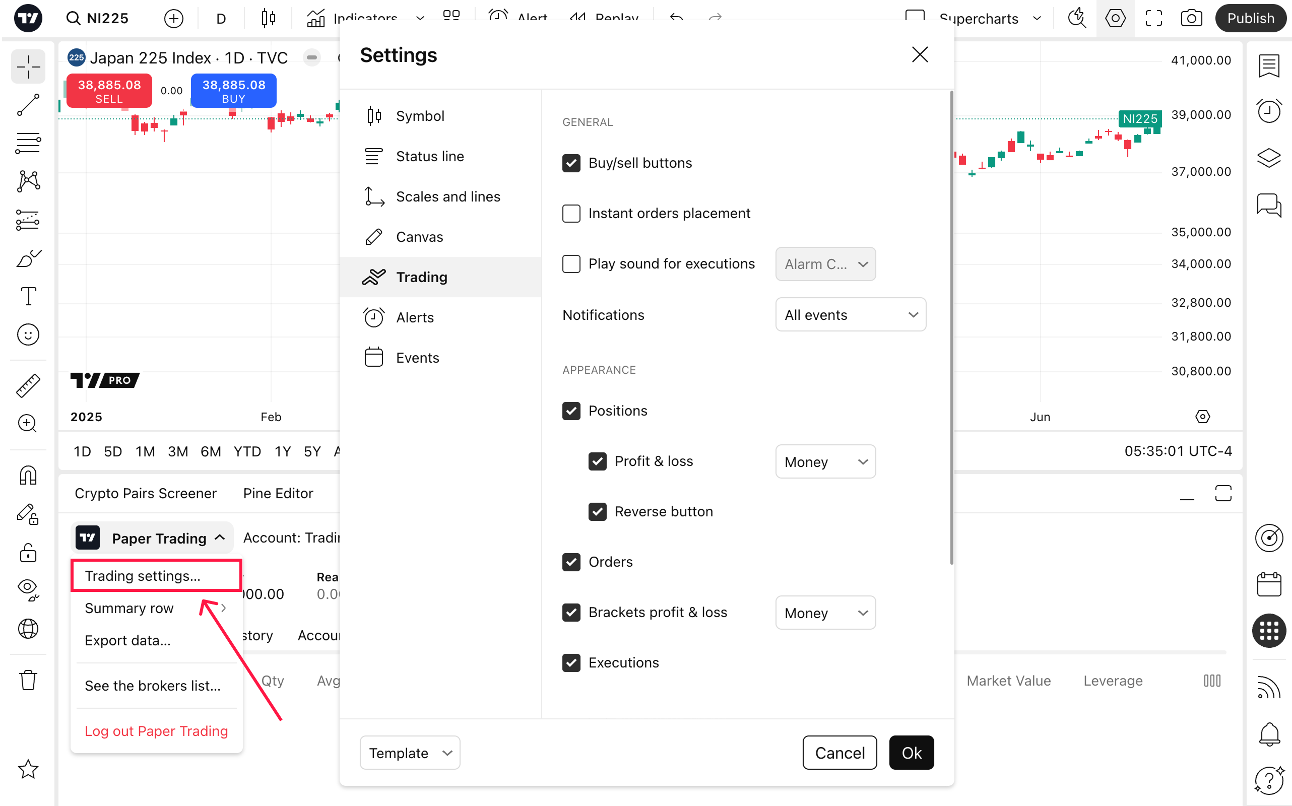 在「交易設定…」中,選擇您想在圖表上顯示的數值。試著開啟或關閉「買賣按鈕」、「持倉」、「訂單」等功能,找到最適合您的配置。