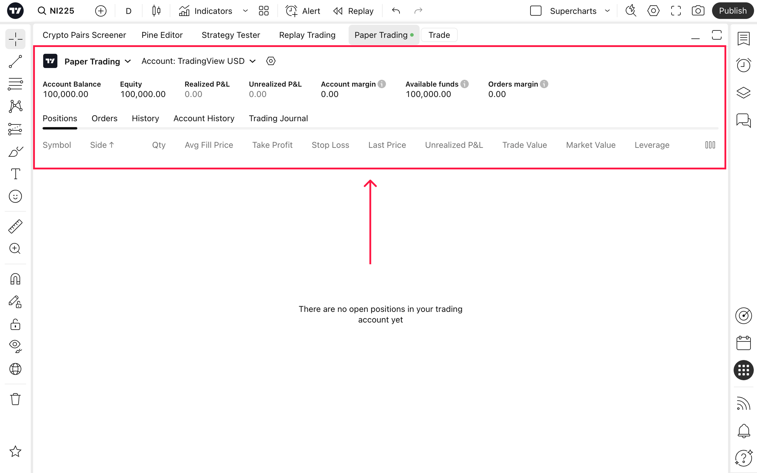 要開始您的交易之旅,請導航至位於超級圖表底部的交易面板。