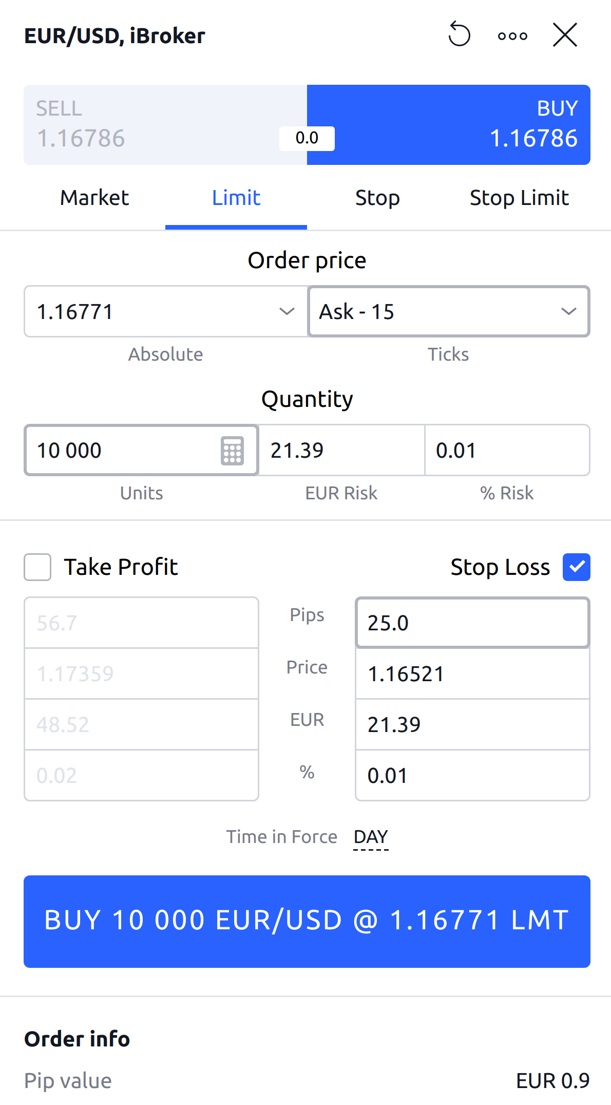 打開訂單後,您可以使用點或價格設定“價格(price)”、“停損(stop loss)”和“停利(take profit)”值。您還可以手動或使用風險/利潤比率計算“量值(quantity)”,並設定您的訂單期限。