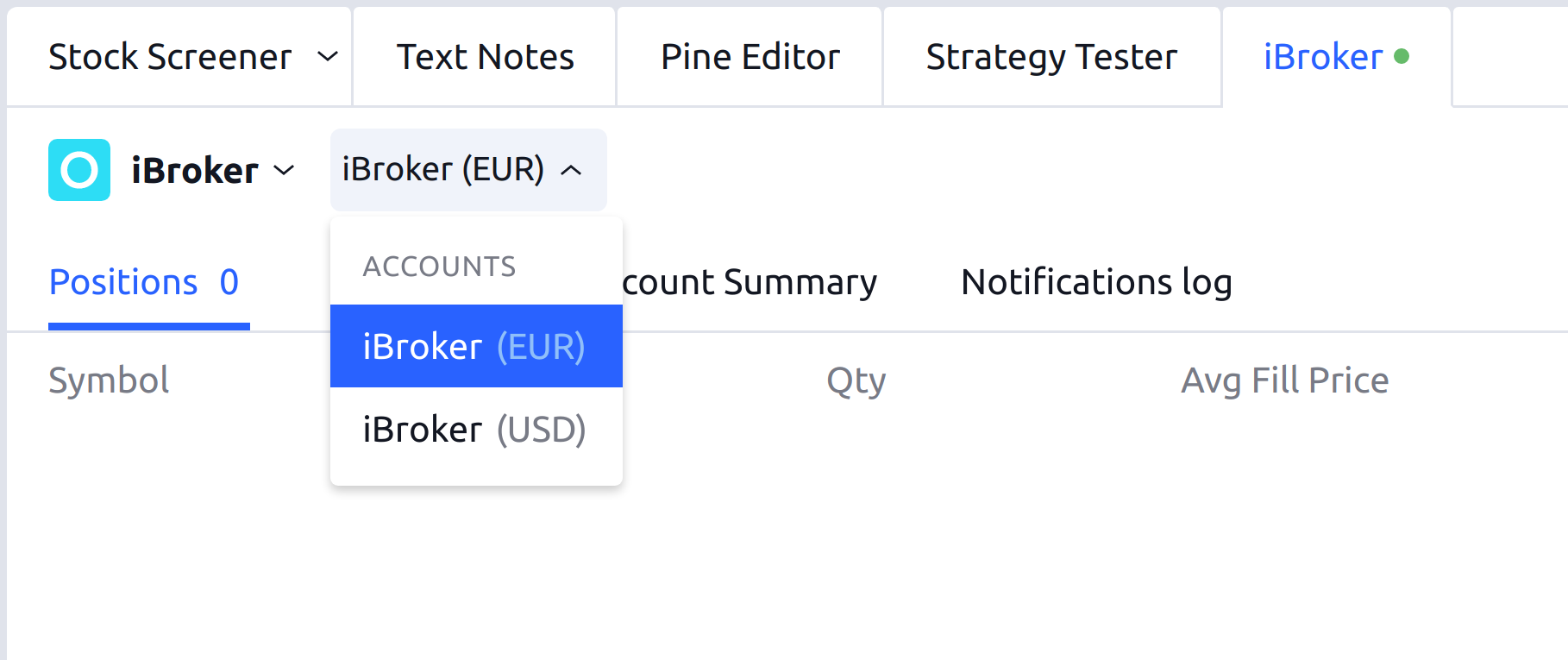 使用您的iBroker交易帳戶登入後,四個頁籤將出現在底部:部位(Positions)、訂單(Orders)、帳戶摘要(Account Summary)和通知日誌(Notification Log)。為方便起見,“訂單”頁籤包含所有可能的訂單狀態的過濾器。每列中的灰線顯示帳戶摘要中的關鍵值。