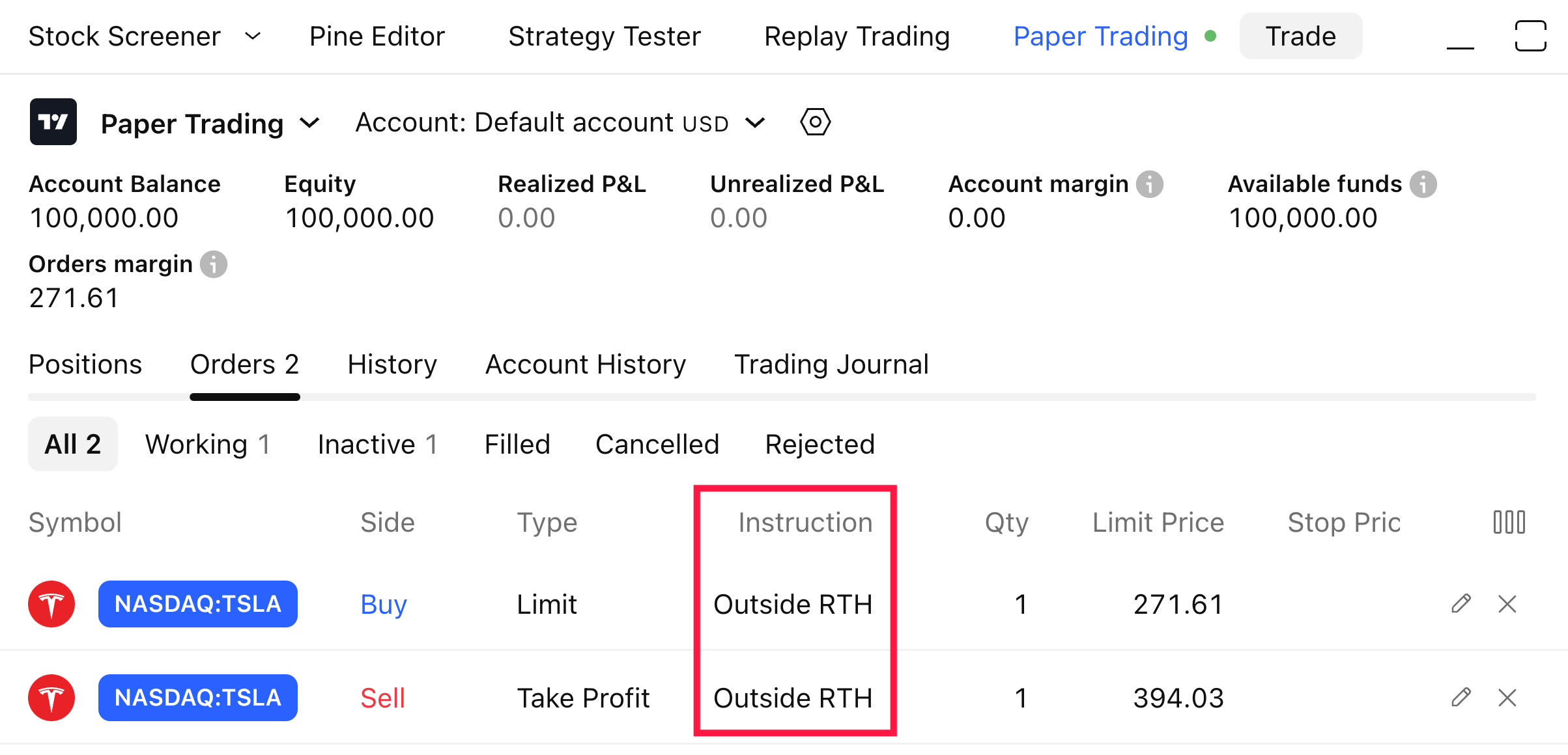 您可以在交易面板的訂單頁籤中查看哪些訂單可以在正常交易時間之外執行。我們新增了一個特殊欄位“指令”,其中此類訂單的值為“RTH之外”。