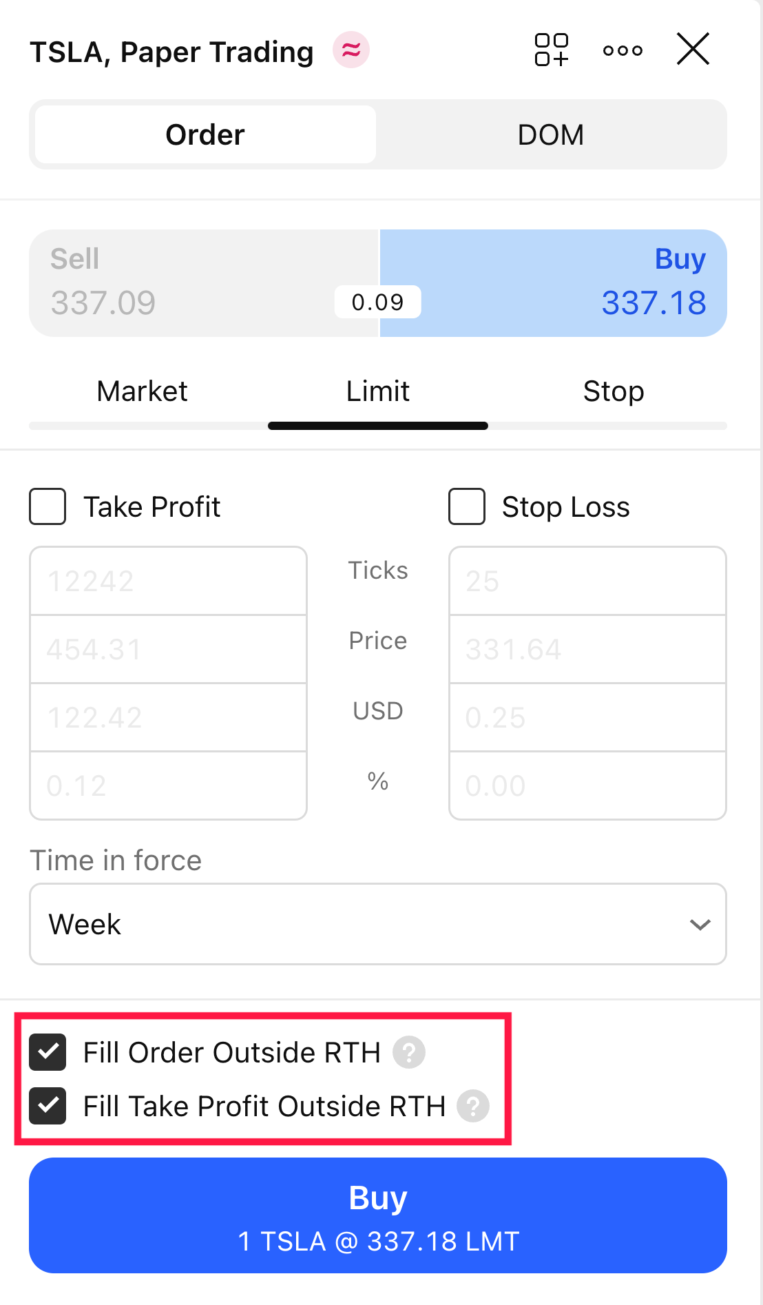 - 在RTH之外執行訂單 - 允許在延長時間內執行限價單。