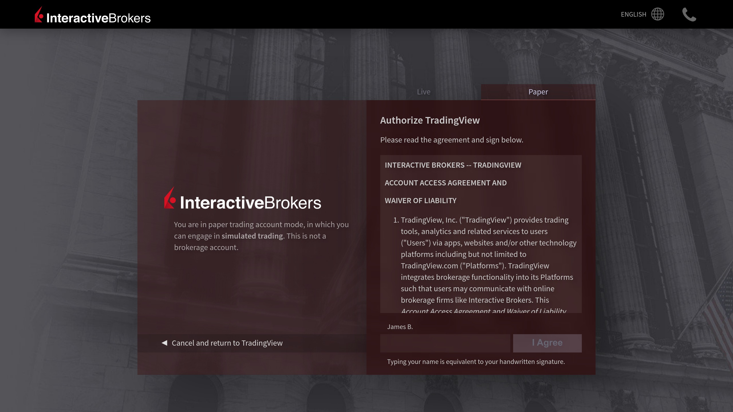 - 訪問 tw.tradingview.com/chart並打開交易面板,選擇盈透證券並點擊連接;