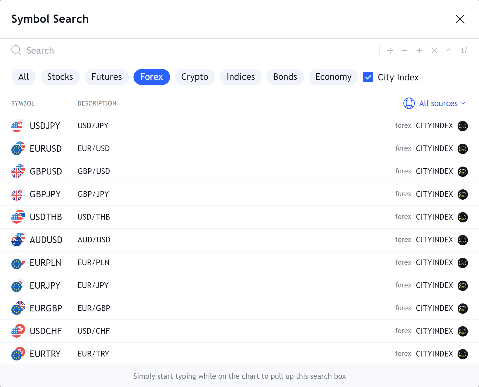 要查詢City Index的所有可交易商品,請透過交易面板連接到經紀商,然後打開商品搜尋,最後確認City Index複選框處於勾選狀態。此功能僅在您登入經紀帳戶後才可使用。