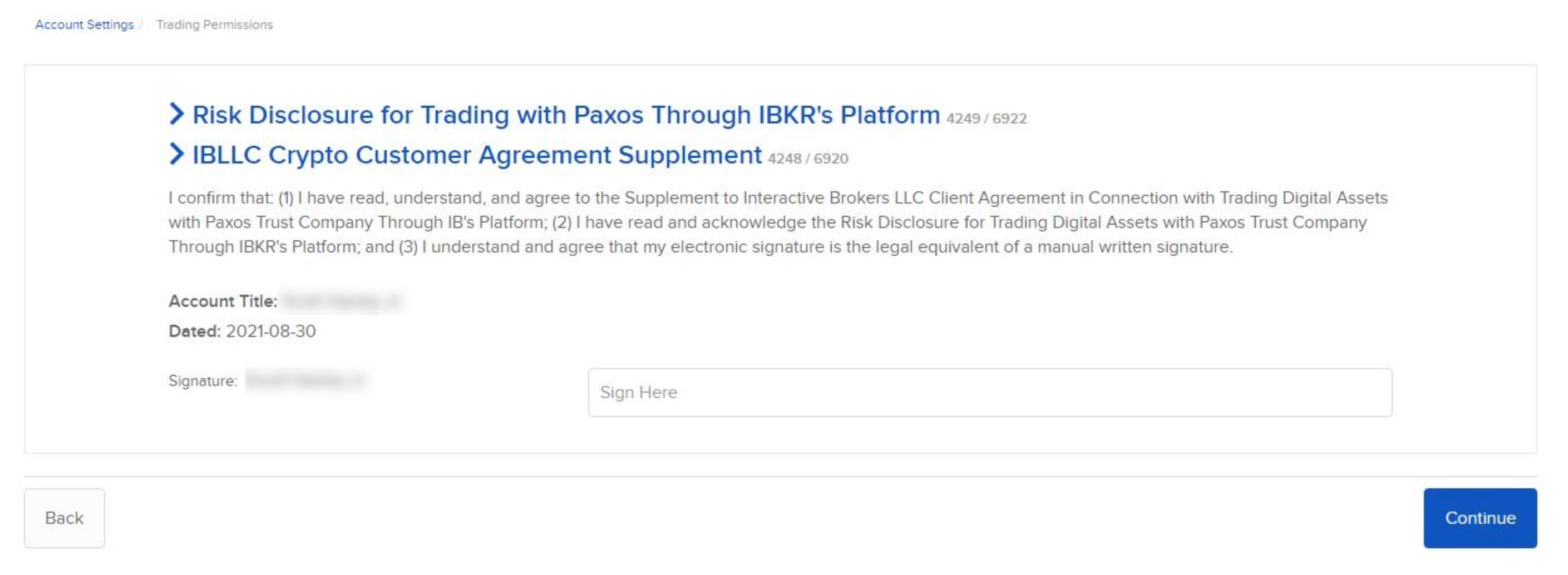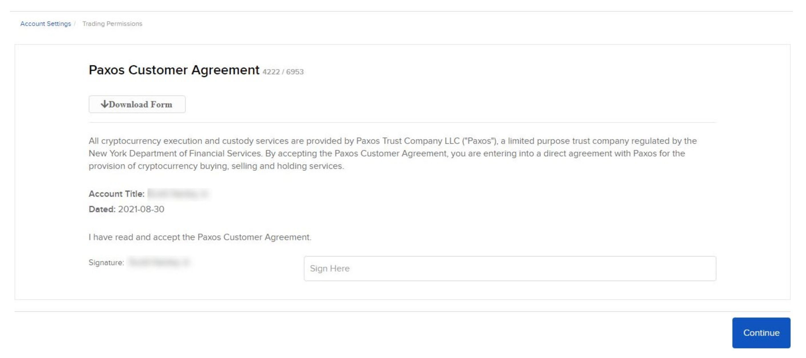 如果適用,請查看Paxos客戶協議,在「在此簽名」的方塊中輸入您的姓名,然後按一下繼續。